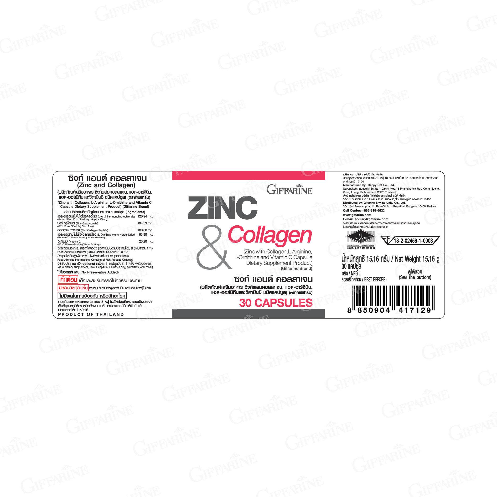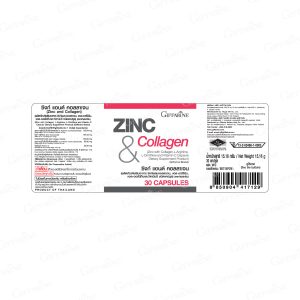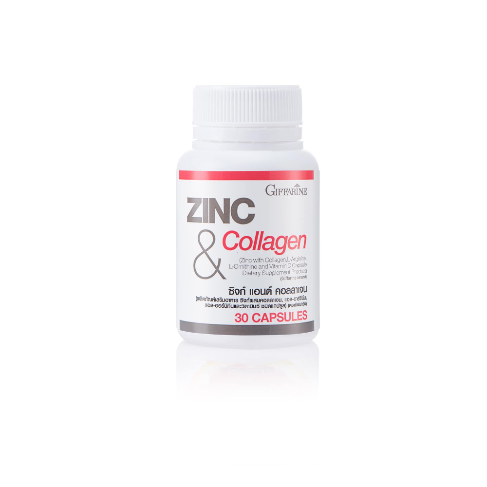ผลิตภัณฑ์เสริมอาหาร ซิงค์ผสมคอลลาเจนแอล-อาร์จินินแอล-ออร์นิทีนและวิตามินซี ชนิดแคปซูล (ตรา กิฟฟารีน) ส่วนประกอบที่สำคัญโดยประมาณใน 1 แคปซูล : แอล-อาร์จินีน โมโนไฮโดรคลอไรด์ 120.94 มก. ซิงค์ กลูโคเนต 104.53 มก. คอลลาเจนจากปลา 100.00 มก. แอล-ออร์นิทีน โมโนไฮโดรคลอไรด์ 63.80 มก. วิตามิน ซี 20.20 มก.