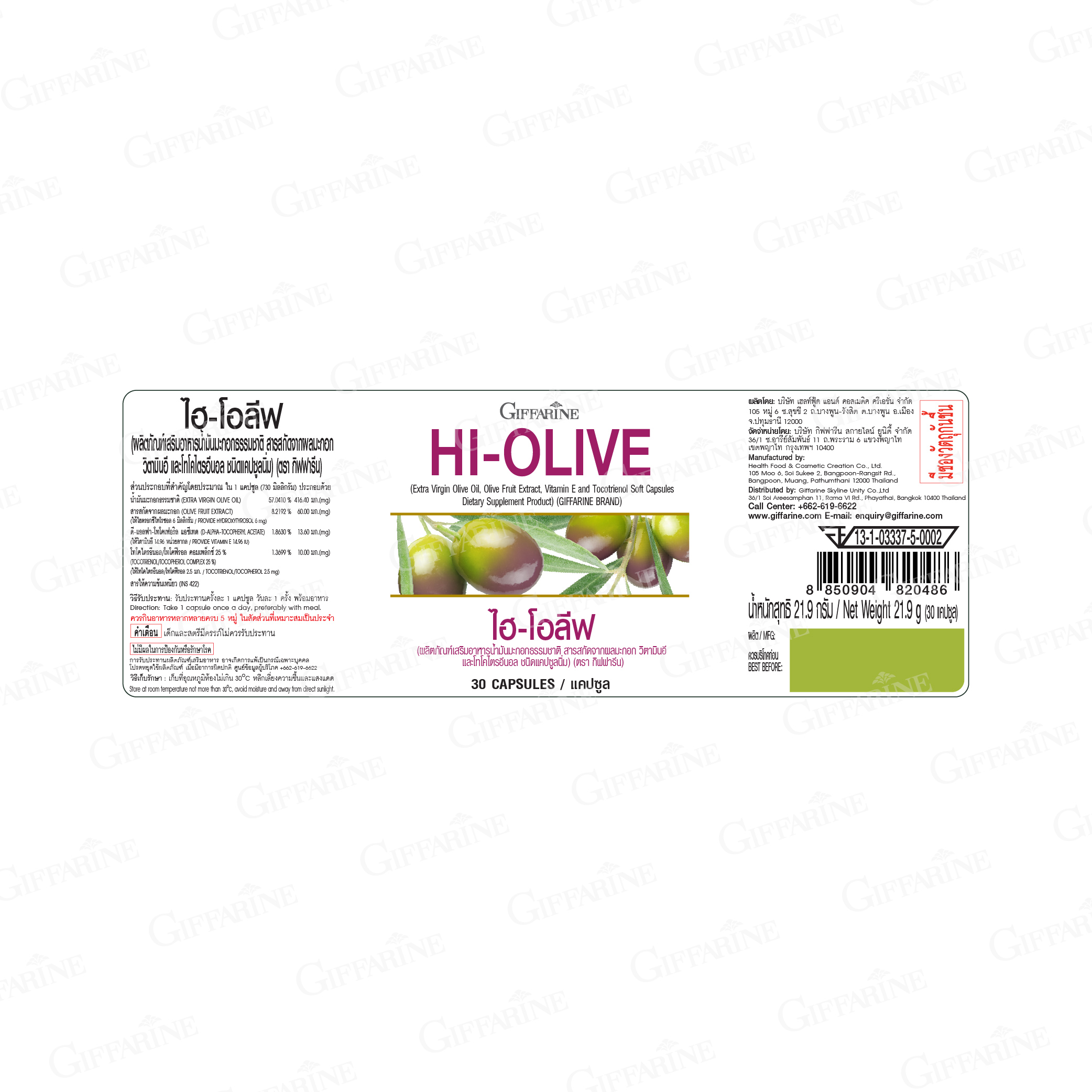 ผลิตภัณฑ์เสริมอาหารน้ำมันมะกอกธรรมชาติ สารสกัดจากผลมะกอก วิตามินอี และโทโคไตรอีนอล ชนิดแคปซูลนิ่ม (ตรา กิฟฟารีน)